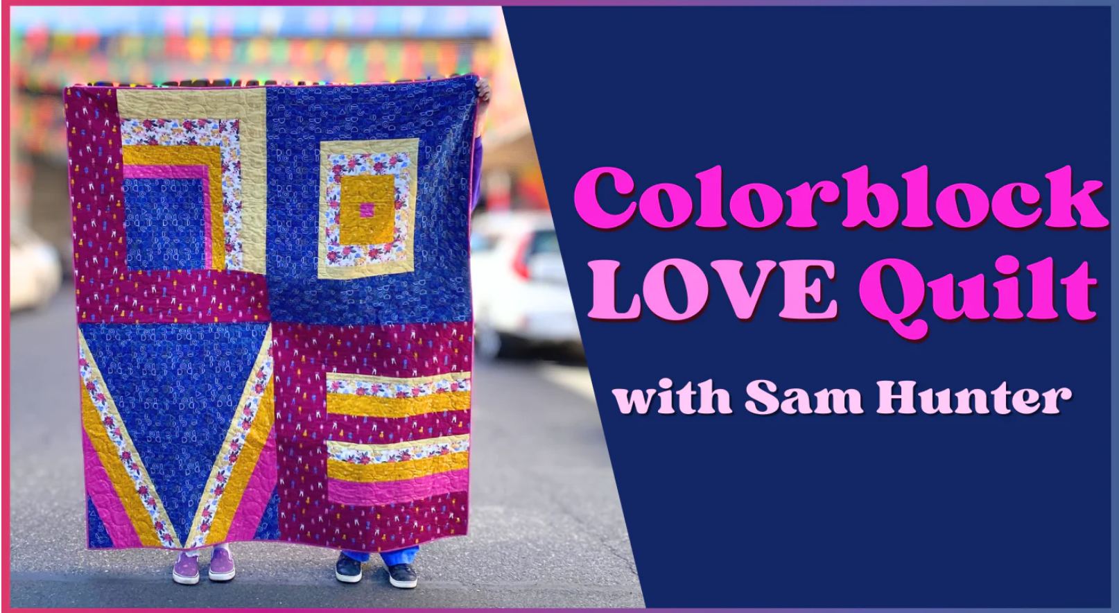 This easy-to-make quilt only needs 6 fabrics to complete! Sam makes it extremely accessible in the Colorblock Love Quilt class. The course includes discussions of the tools you’ll need, color options and a block construction overview. Want to work with a directional fabric in your quilt? Not a problem, because Sam will lead you through how to use the directional fabric in your quilt. Nervous about cutting? Sam walks you through all of the cuts and even shows you how to handle long cuts on a shorter cutting mat.